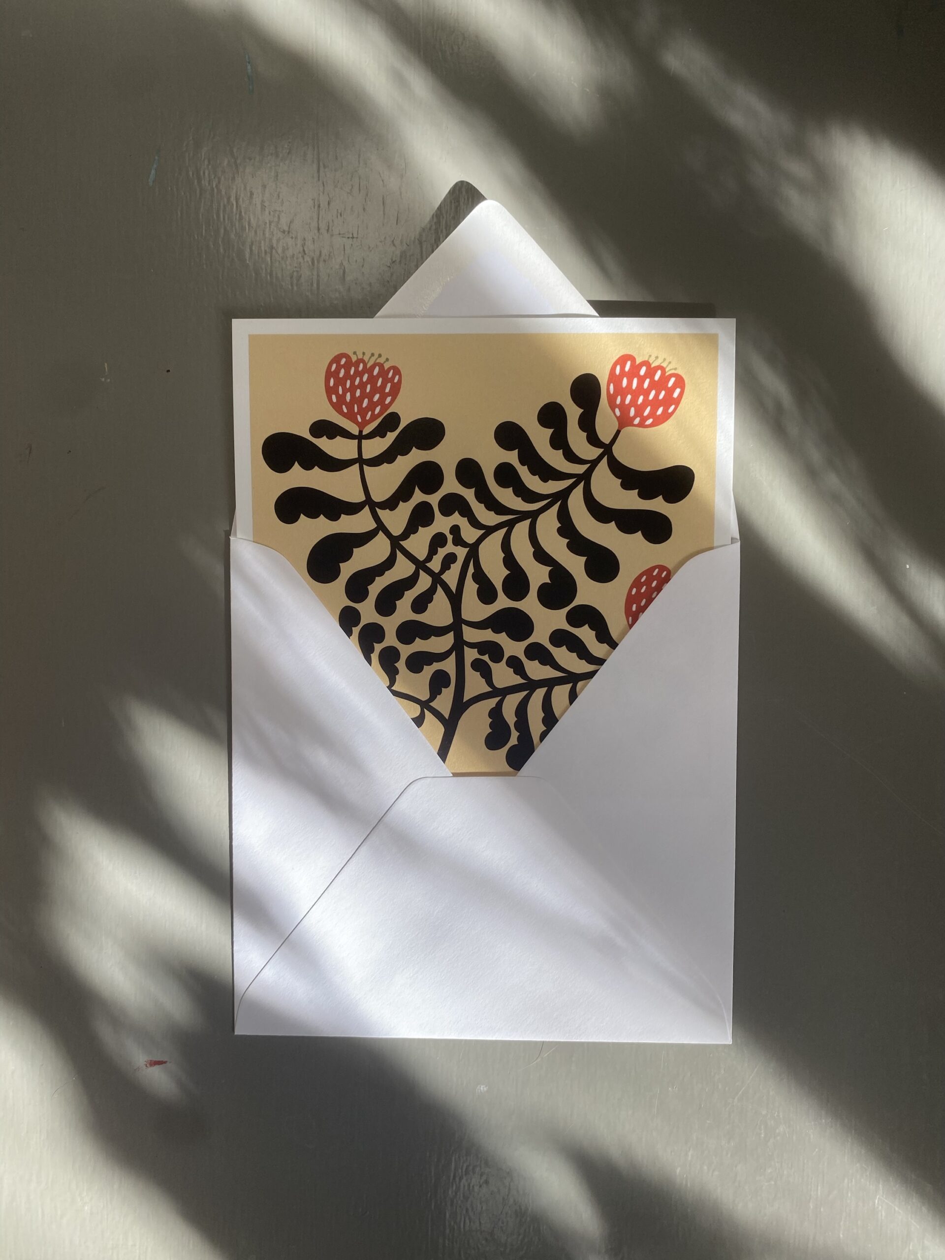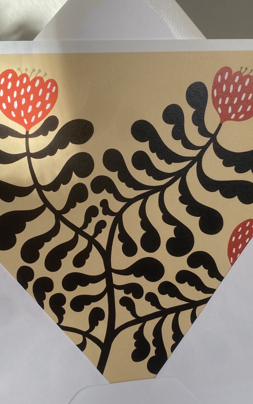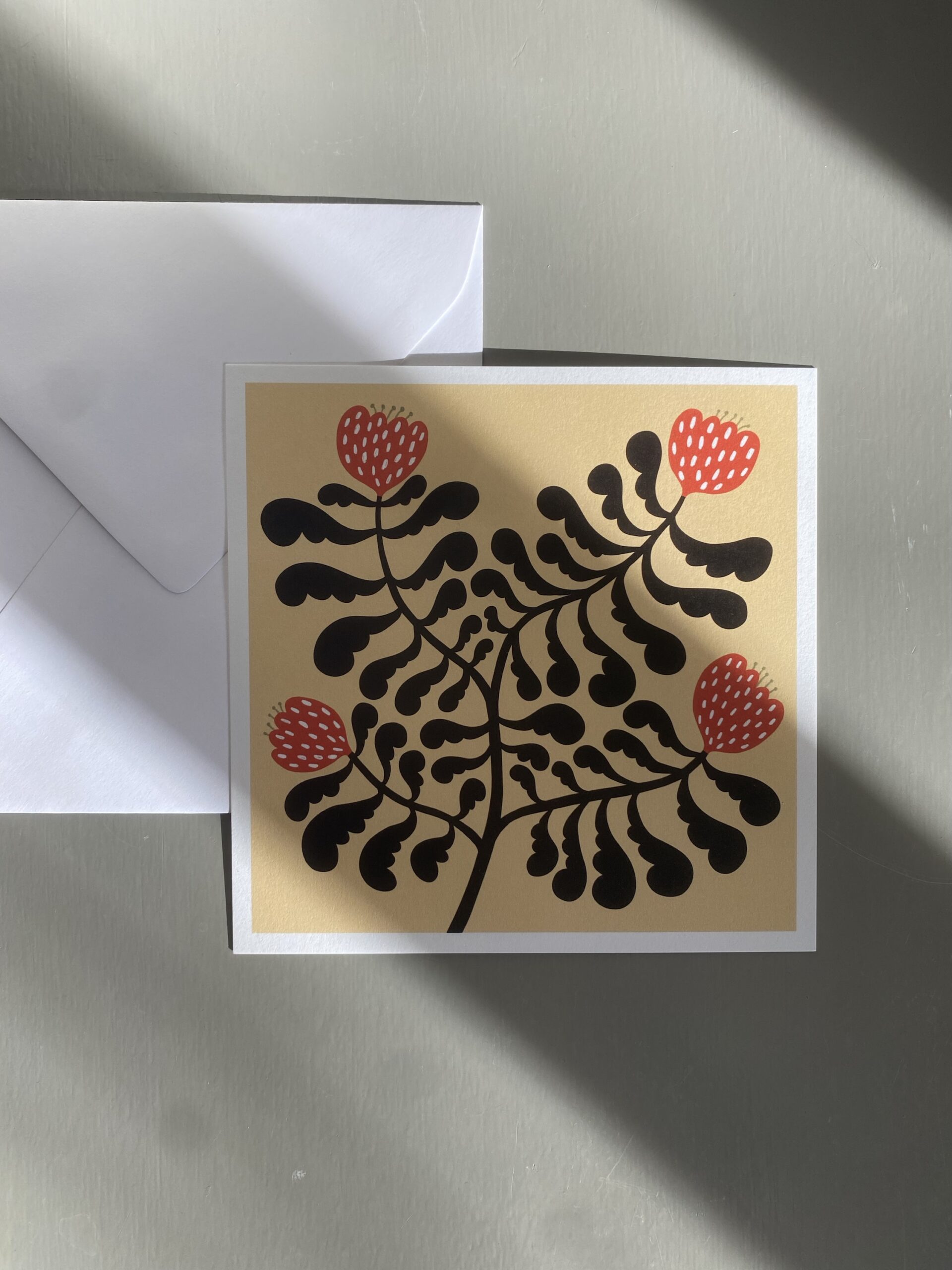 Vykort 15×15 cm, tryckt på tjockt matt papper. Kommer med ett kuvert.
