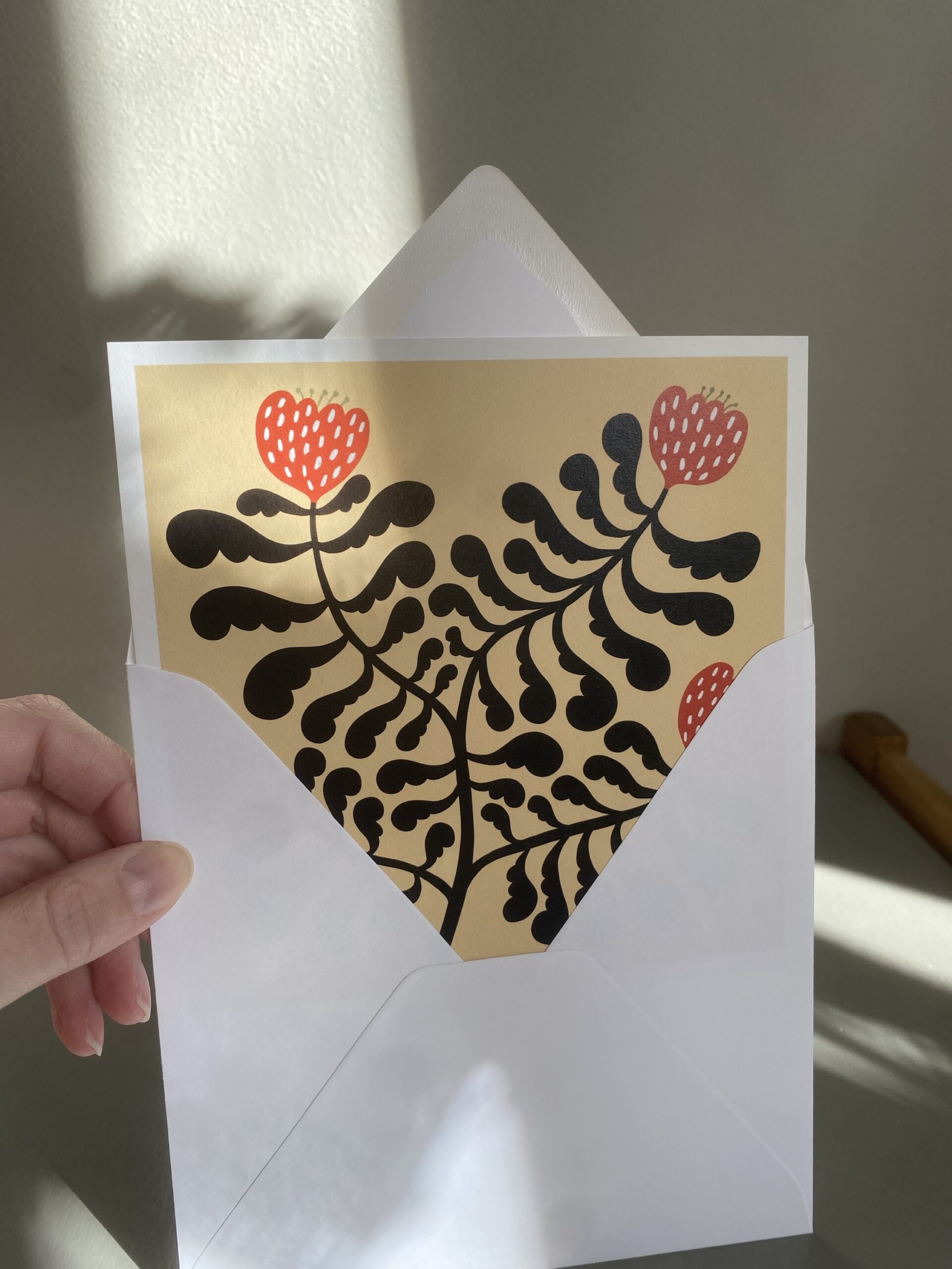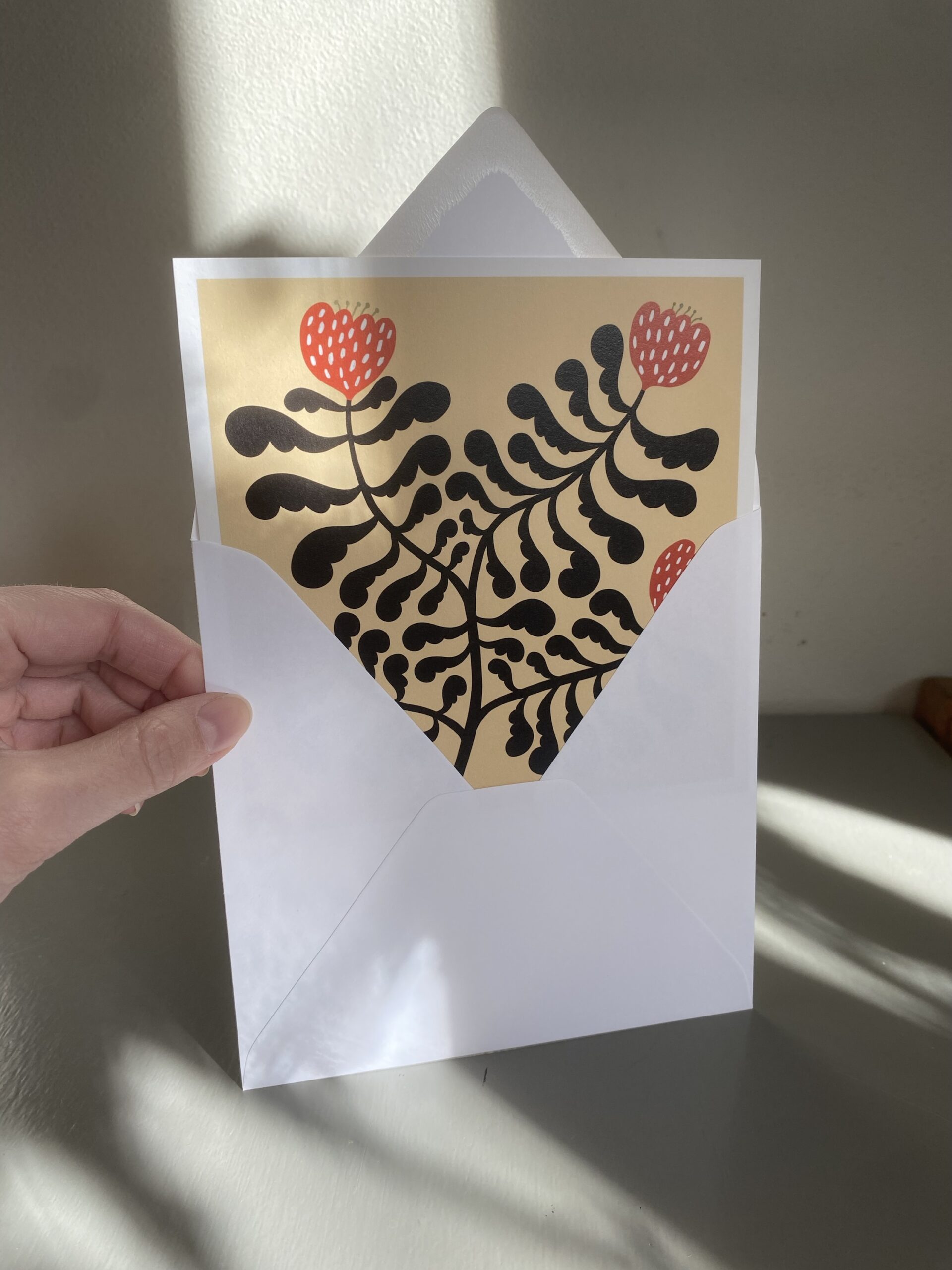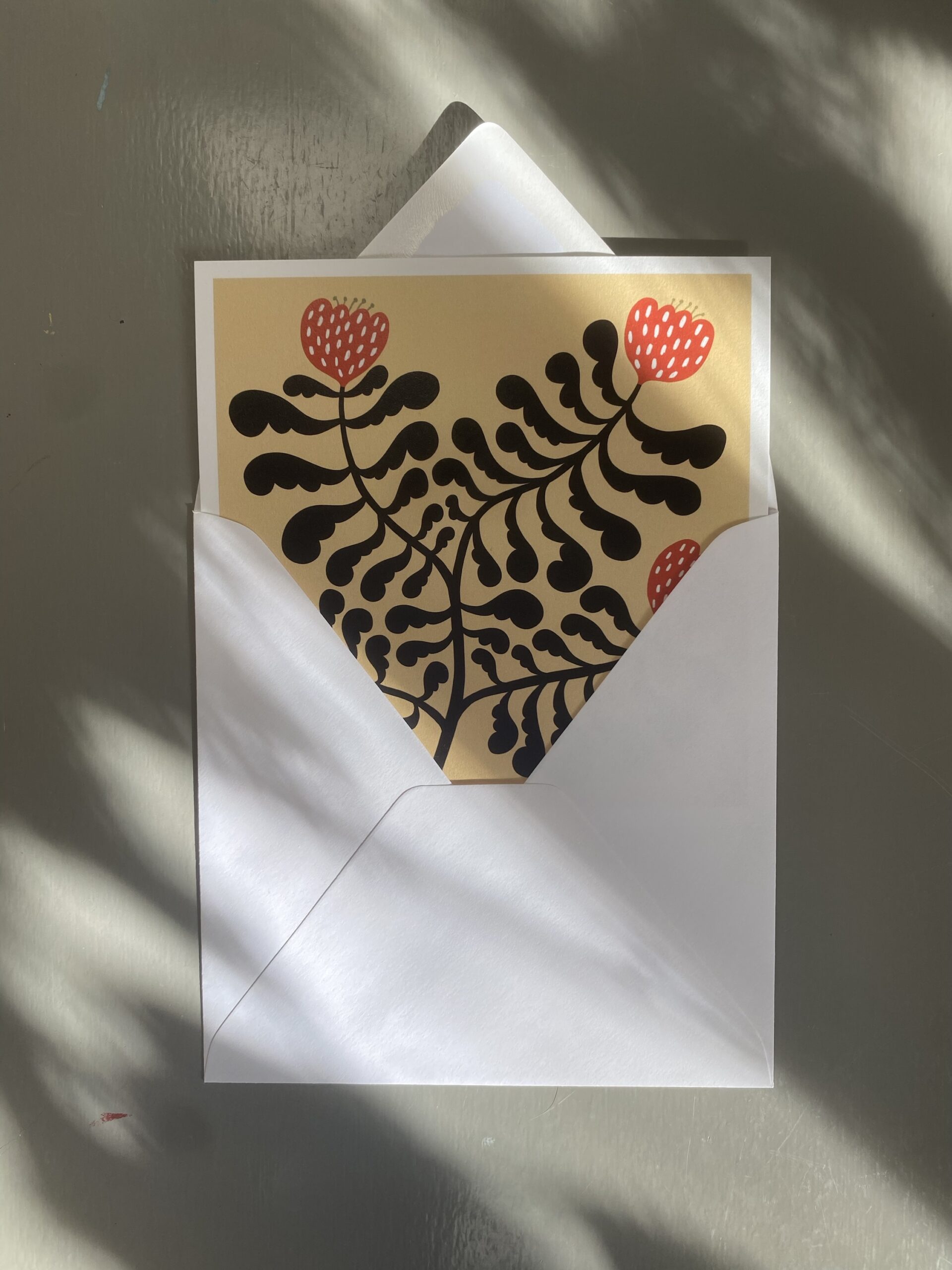 Vykort 15×15 cm, tryckt på tjockt matt papper. Kommer med ett kuvert.