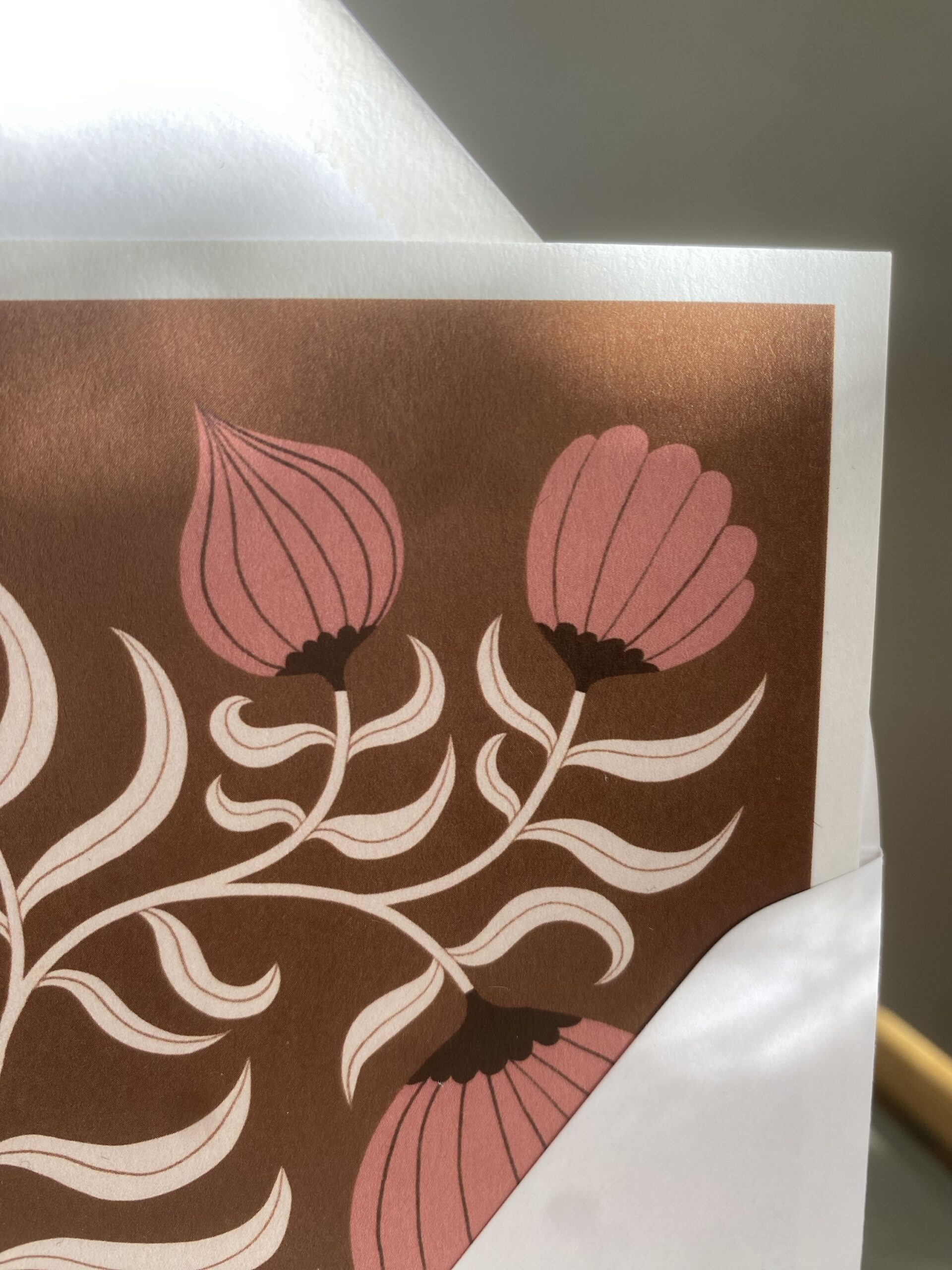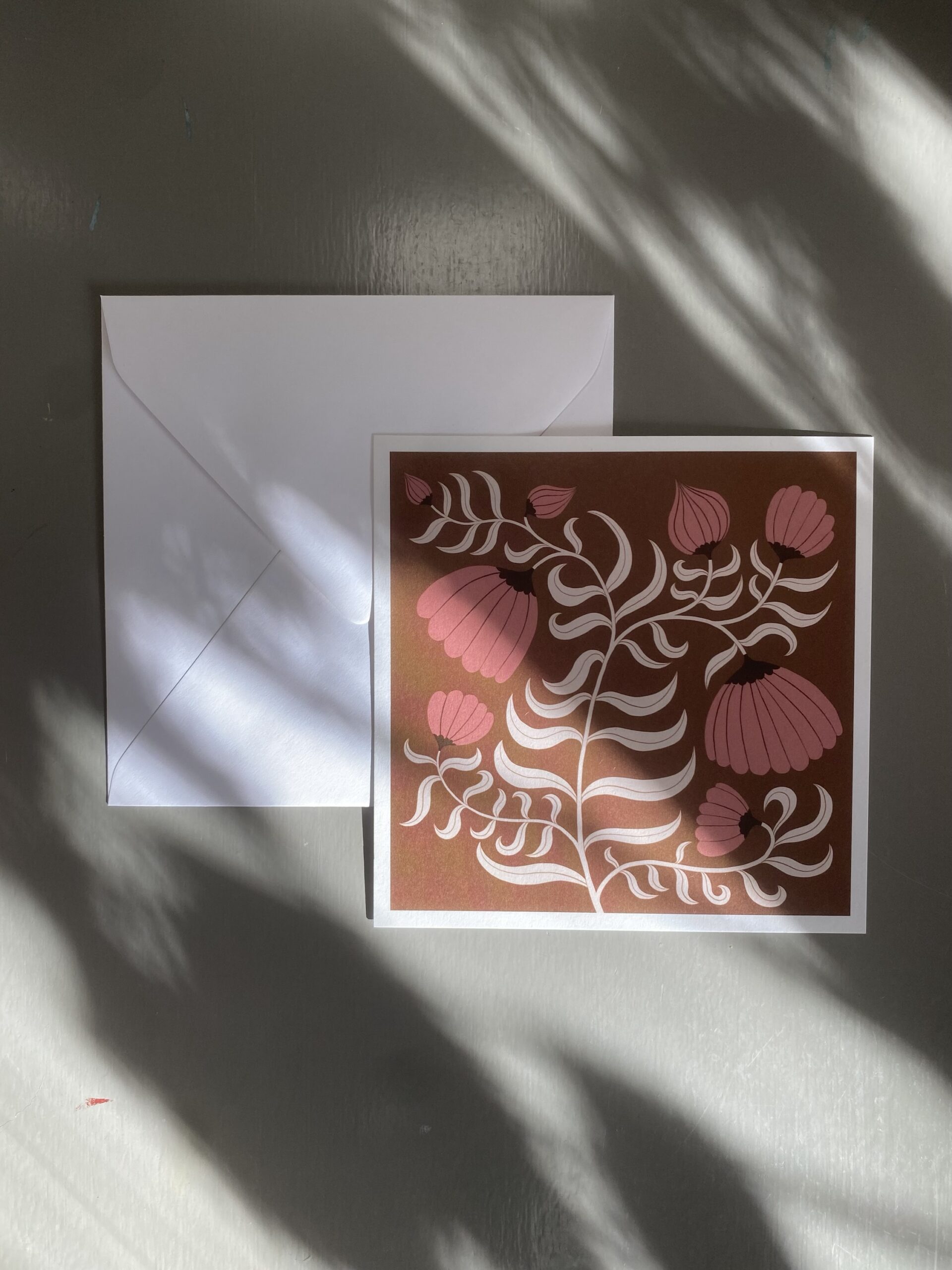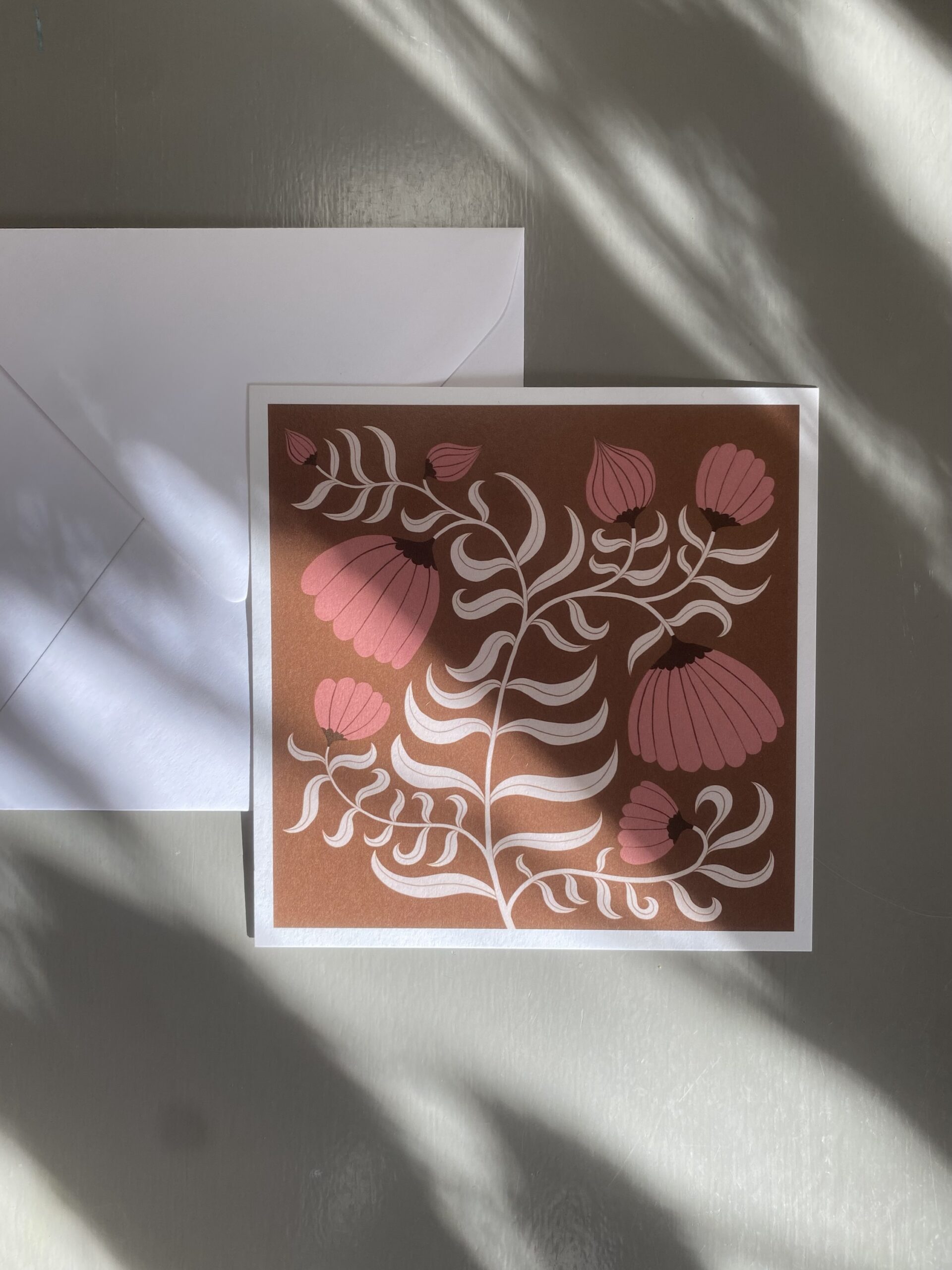 Vykort 15×15 cm, tryckt på tjockt matt papper. Kommer med ett kuvert. Motiv: Blomma brun