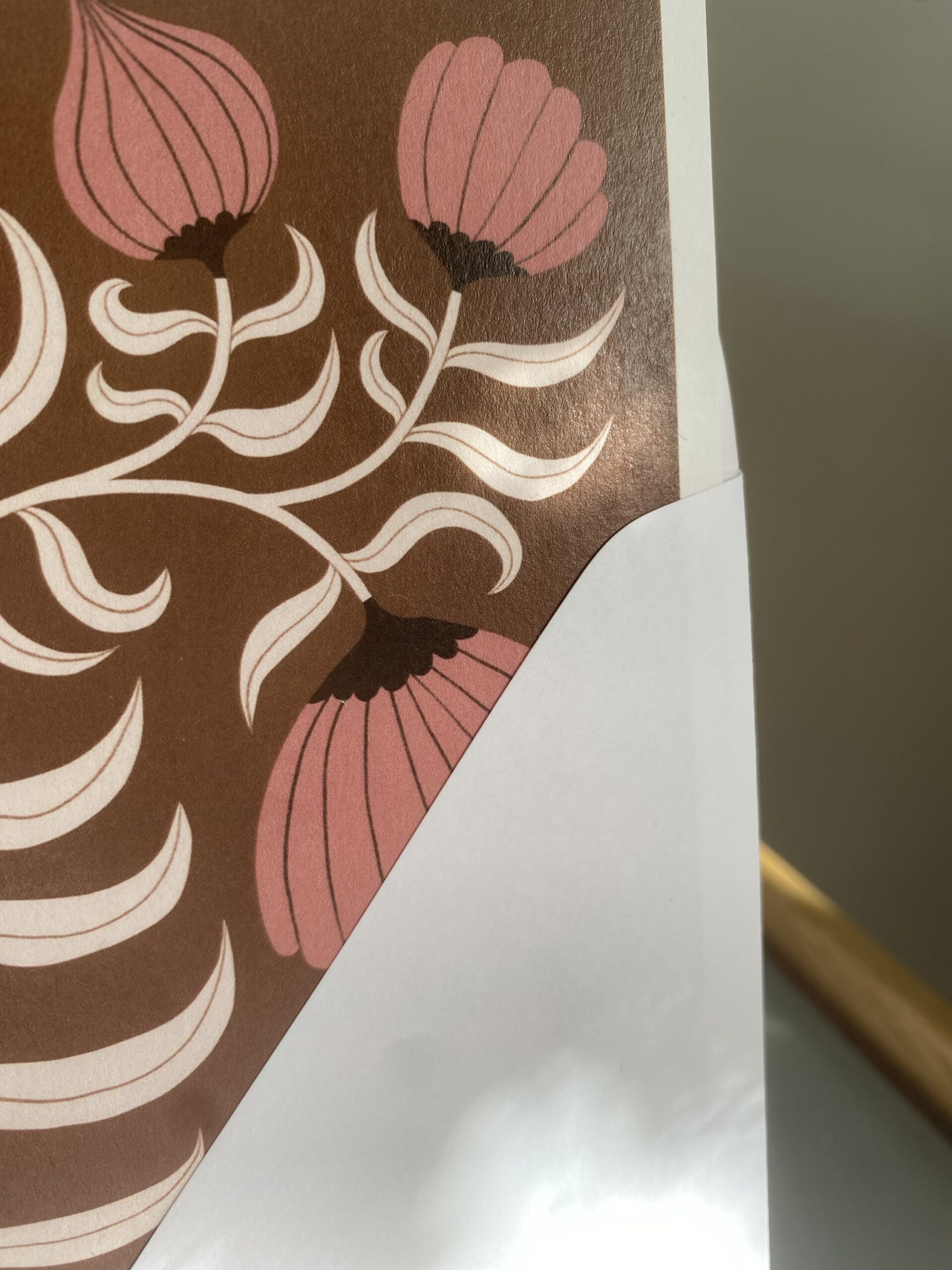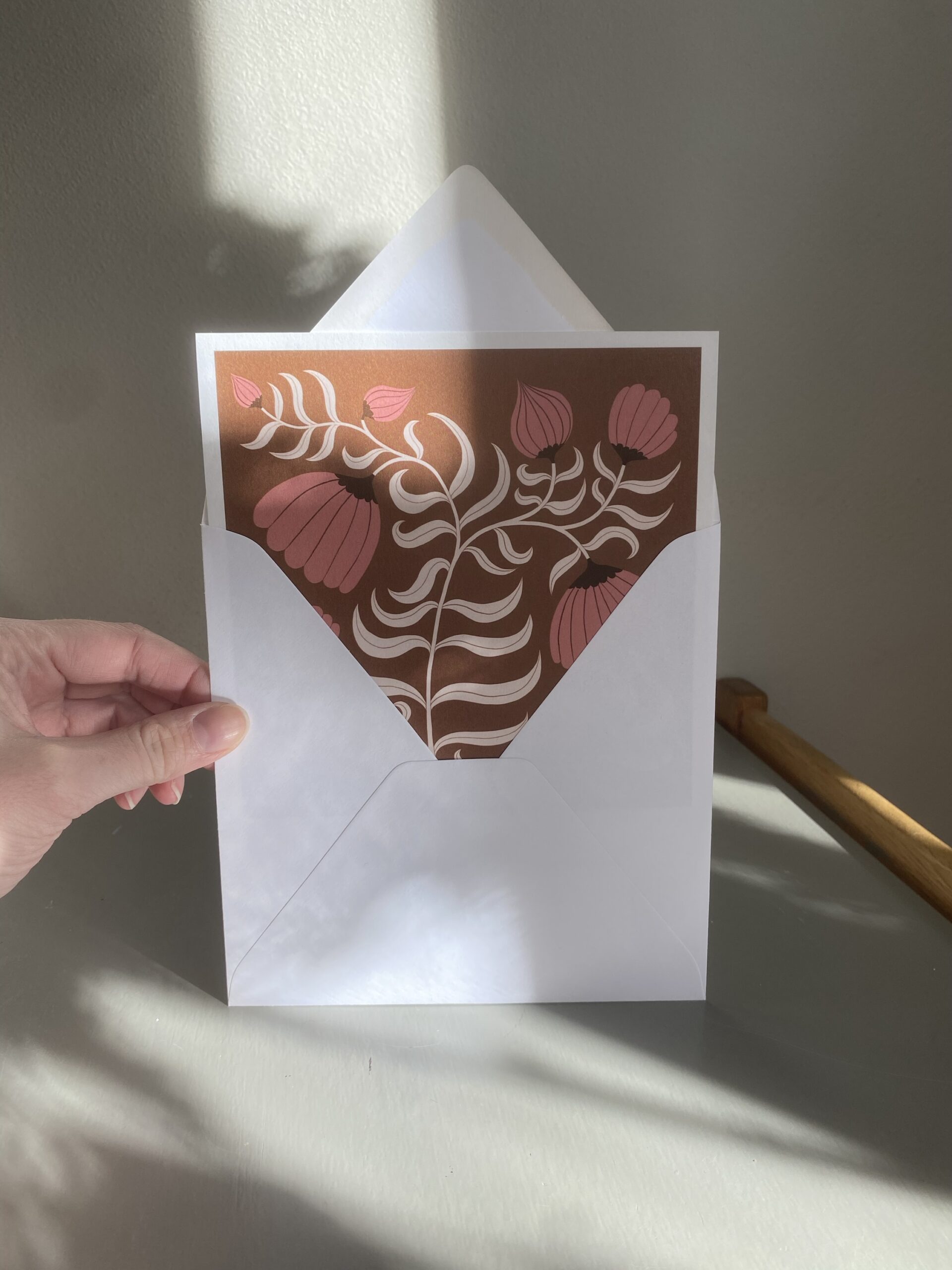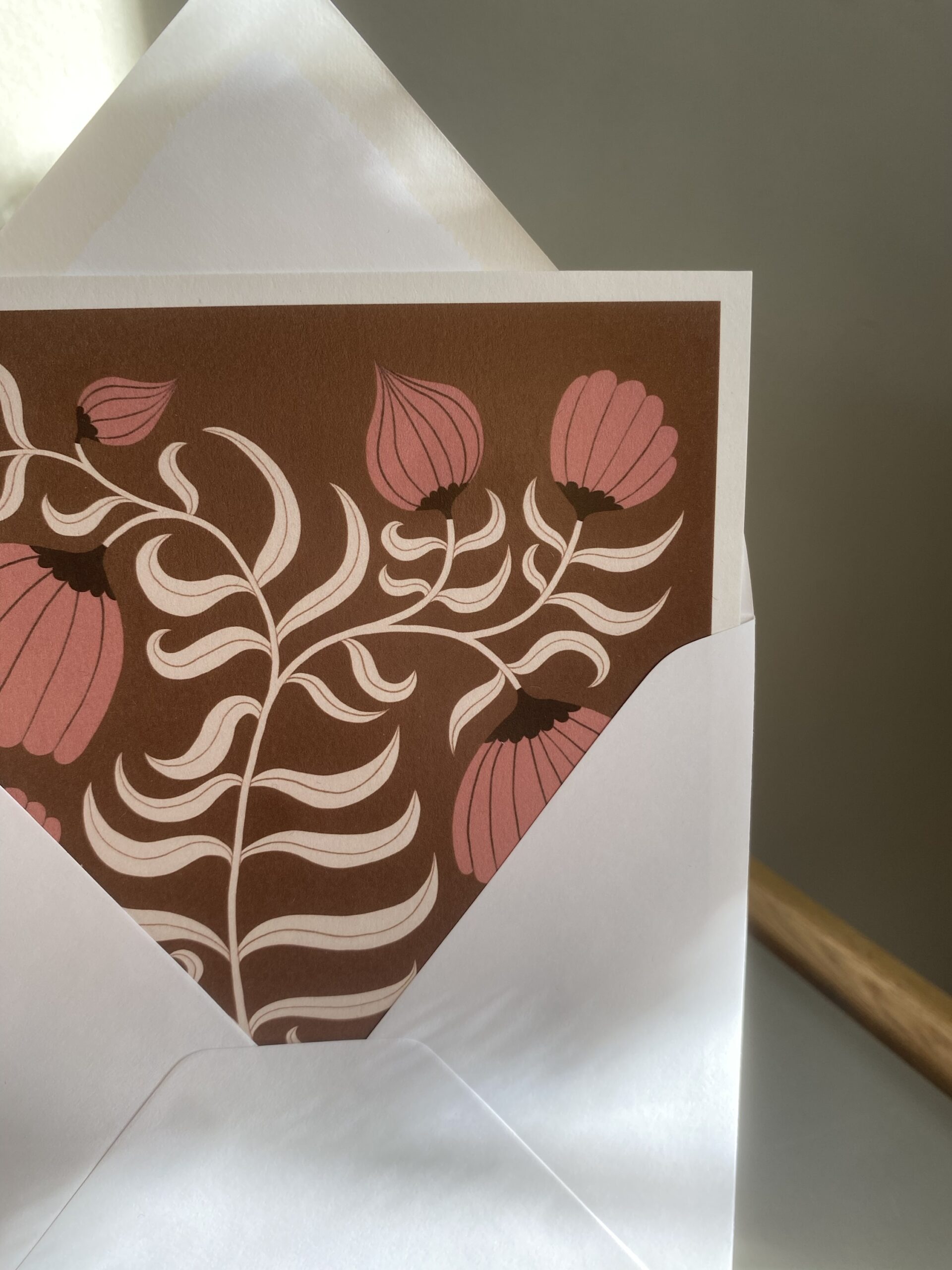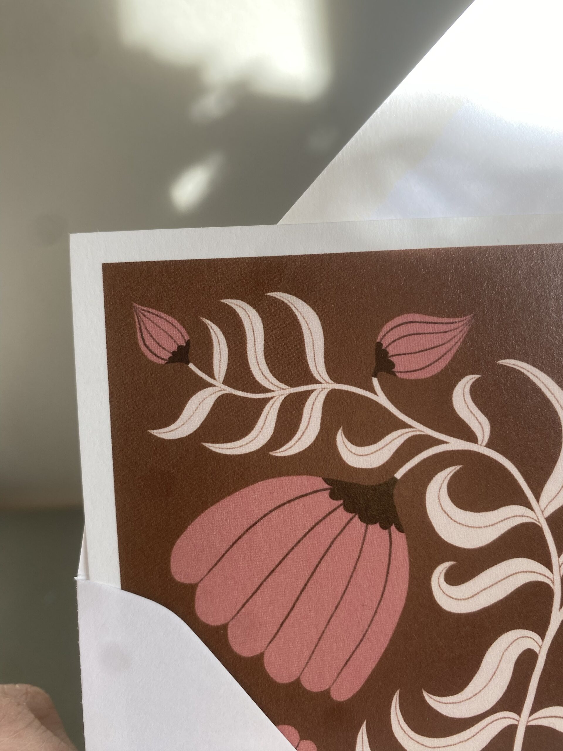 Vykort 15×15 cm, tryckt på tjockt matt papper. Kommer med ett kuvert. Motiv: Blomma brun