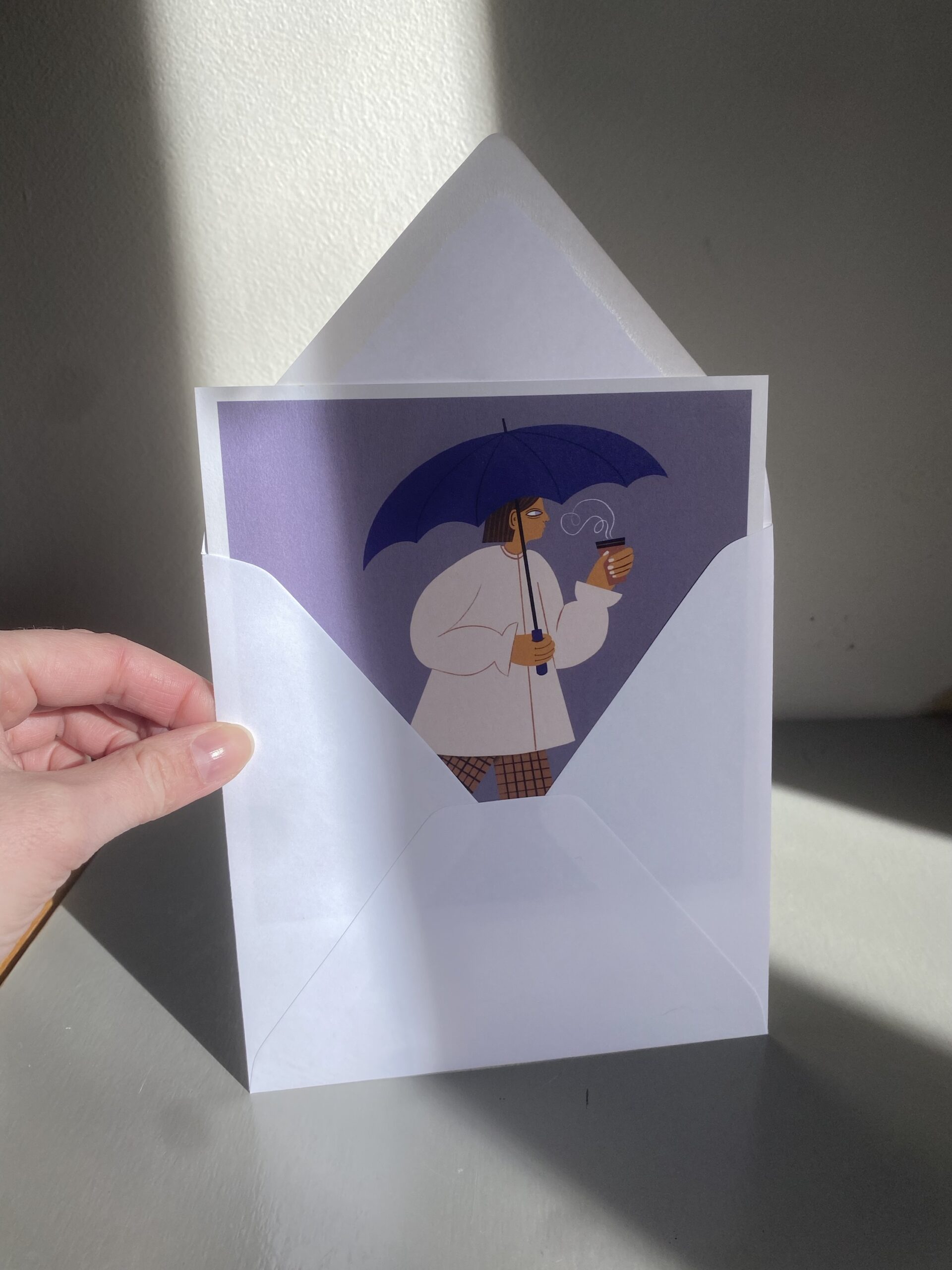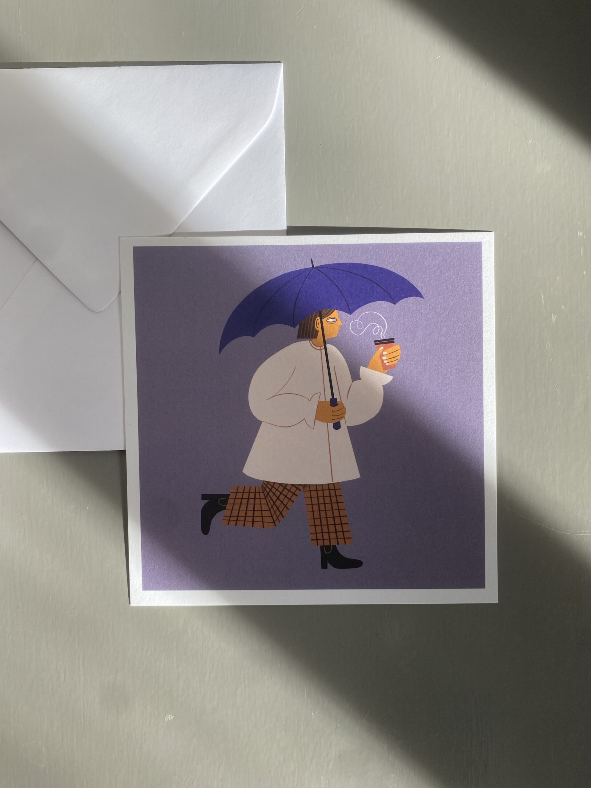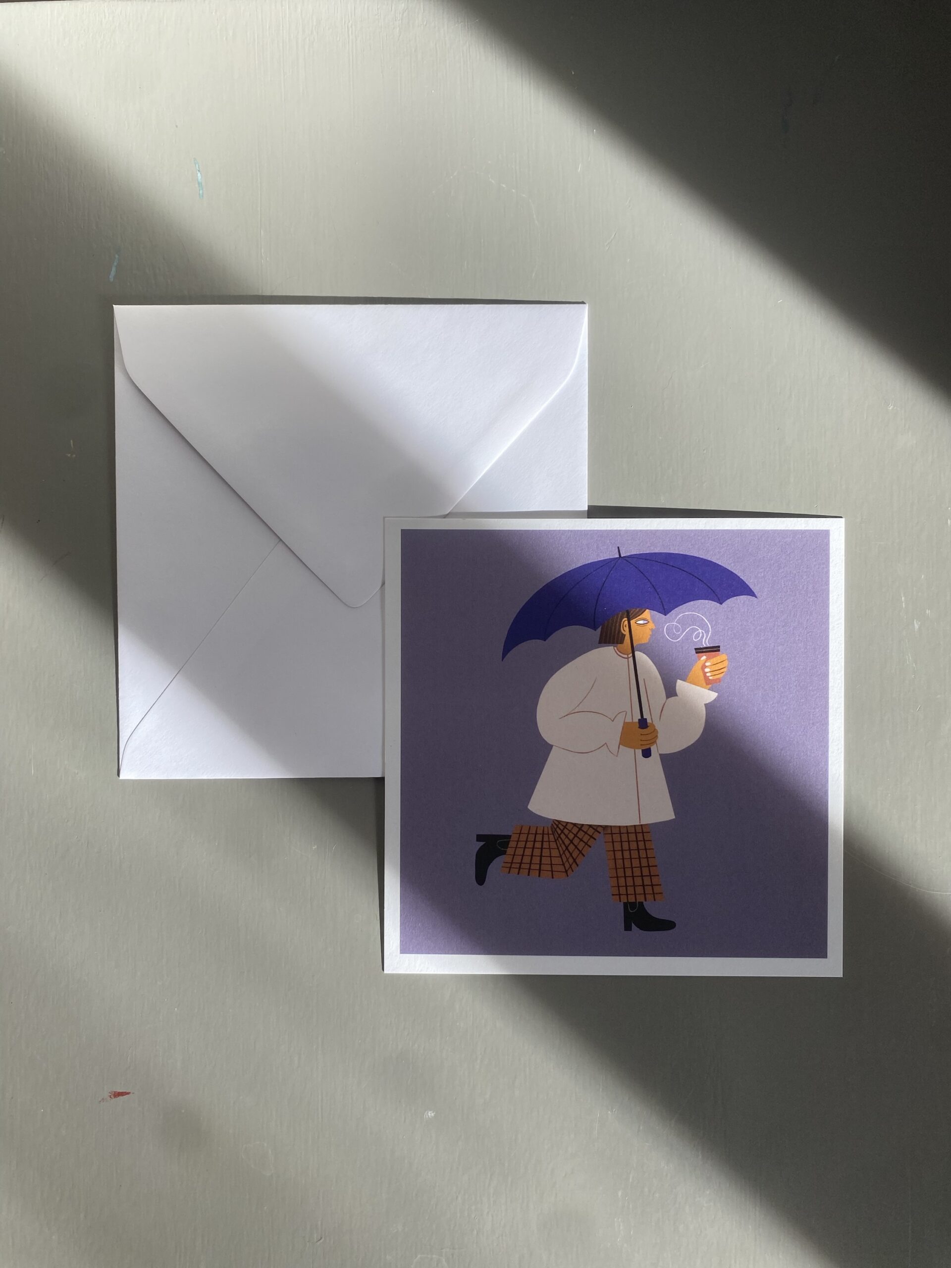 Vykort 15×15 cm, tryckt på tjockt matt papper. Kommer med ett kuvert. Motiv: Kvinna med paraply