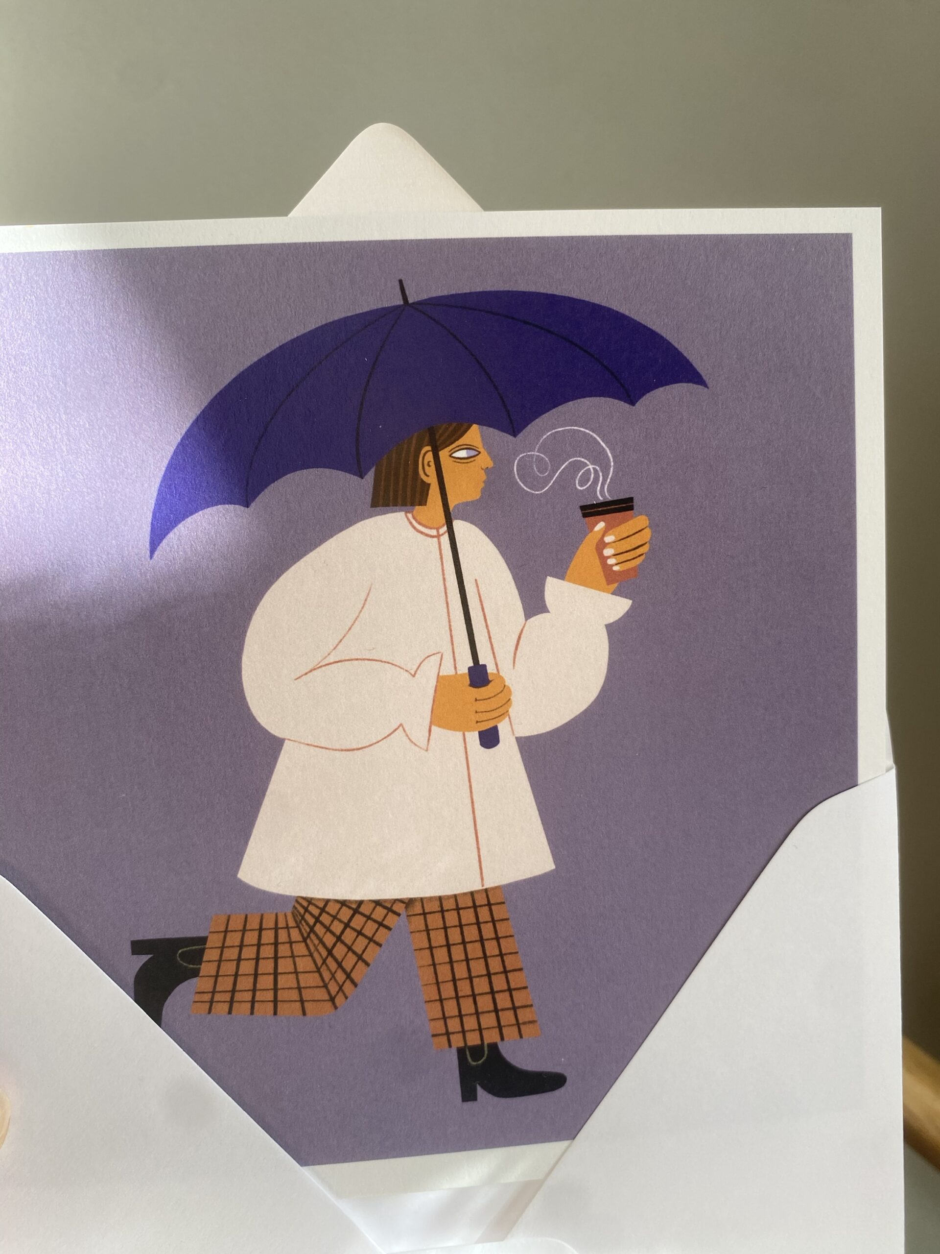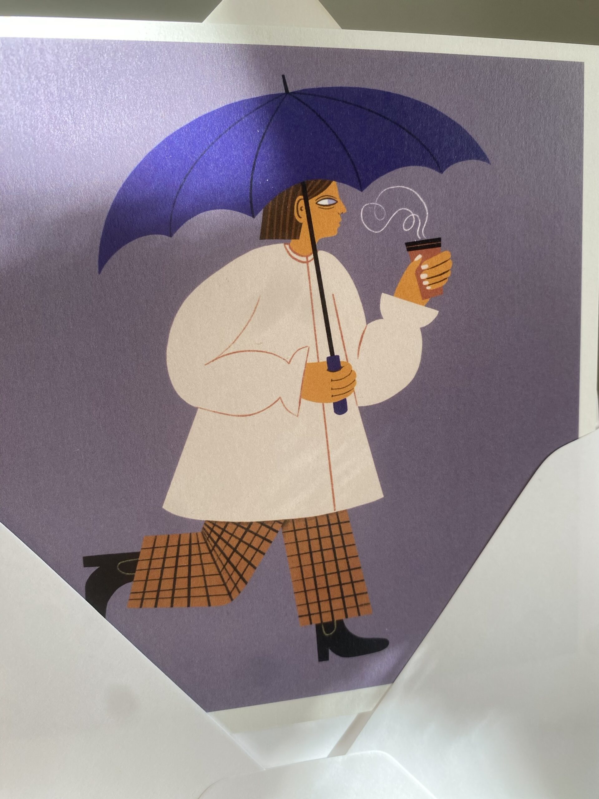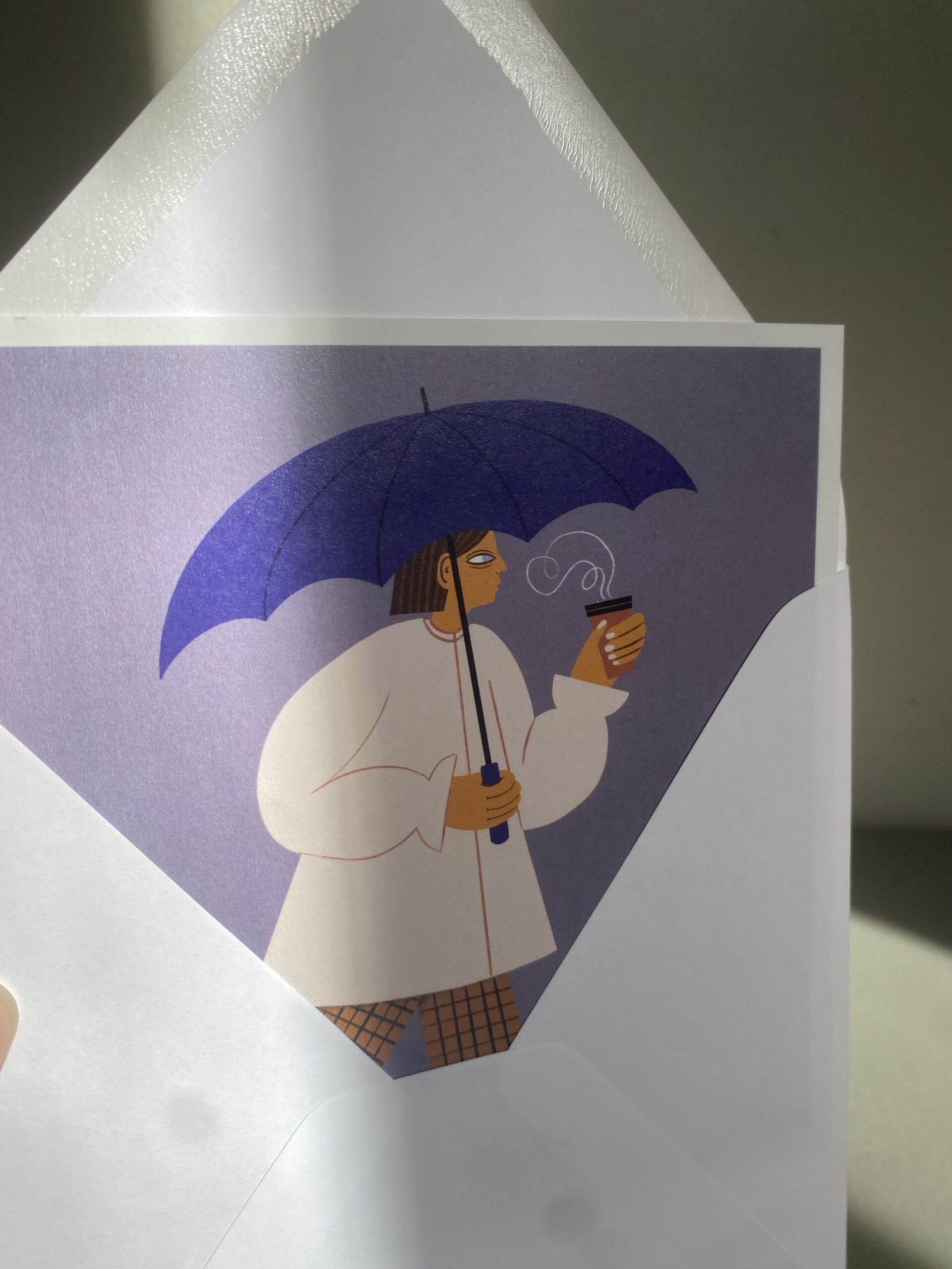Vykort 15×15 cm, tryckt på tjockt matt papper. Kommer med ett kuvert. Motiv: Kvinna med paraply